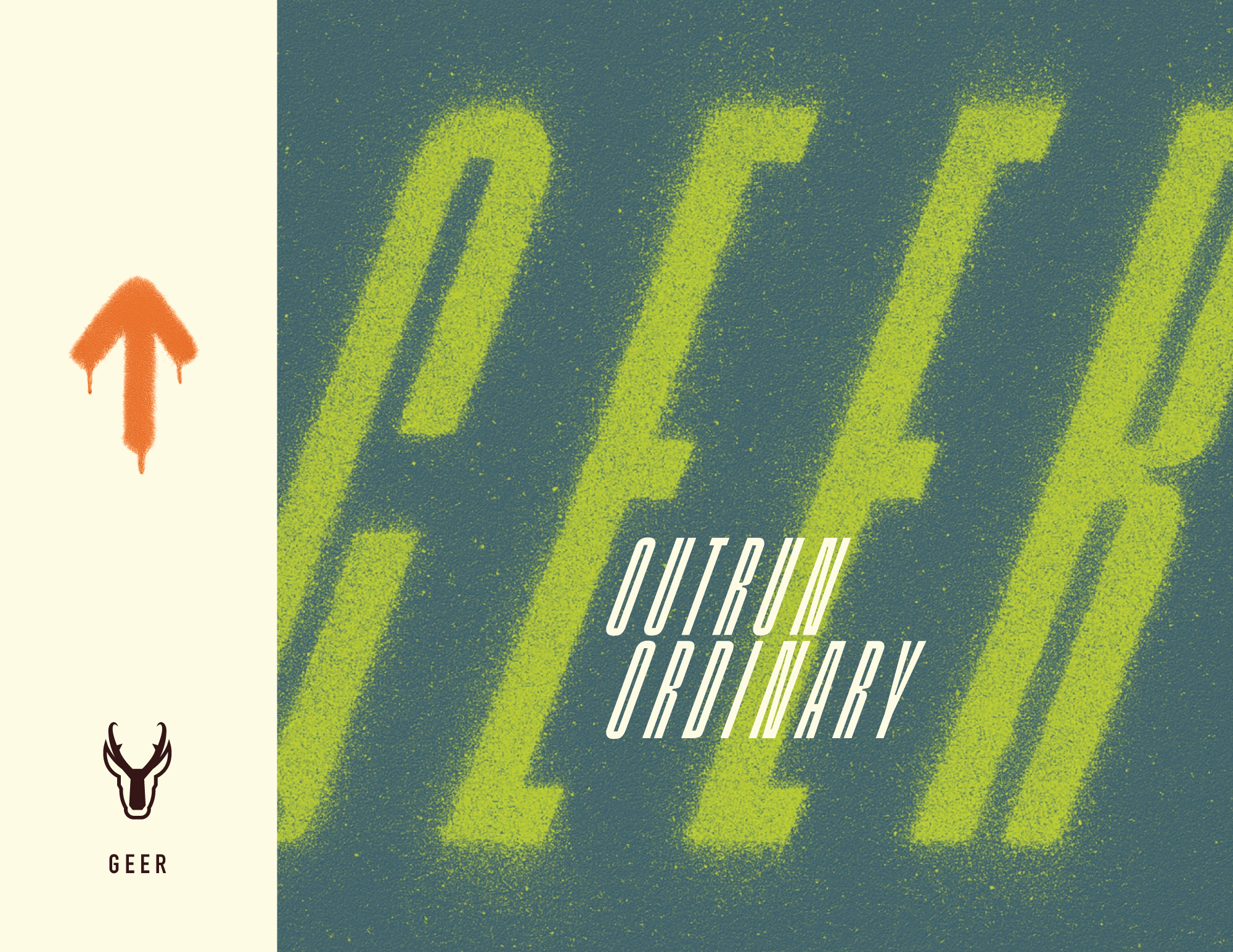 The branding took inspiration from graffiti, nature, and a can-do attitude. A symbol was created from a portrait of a pronghorn—one of the fastest long-distance running animals on the planet. With spray-painted arrows, gritty messaging, and a vibrant color palette, GEER aims to go beyond the horizon without looking back.